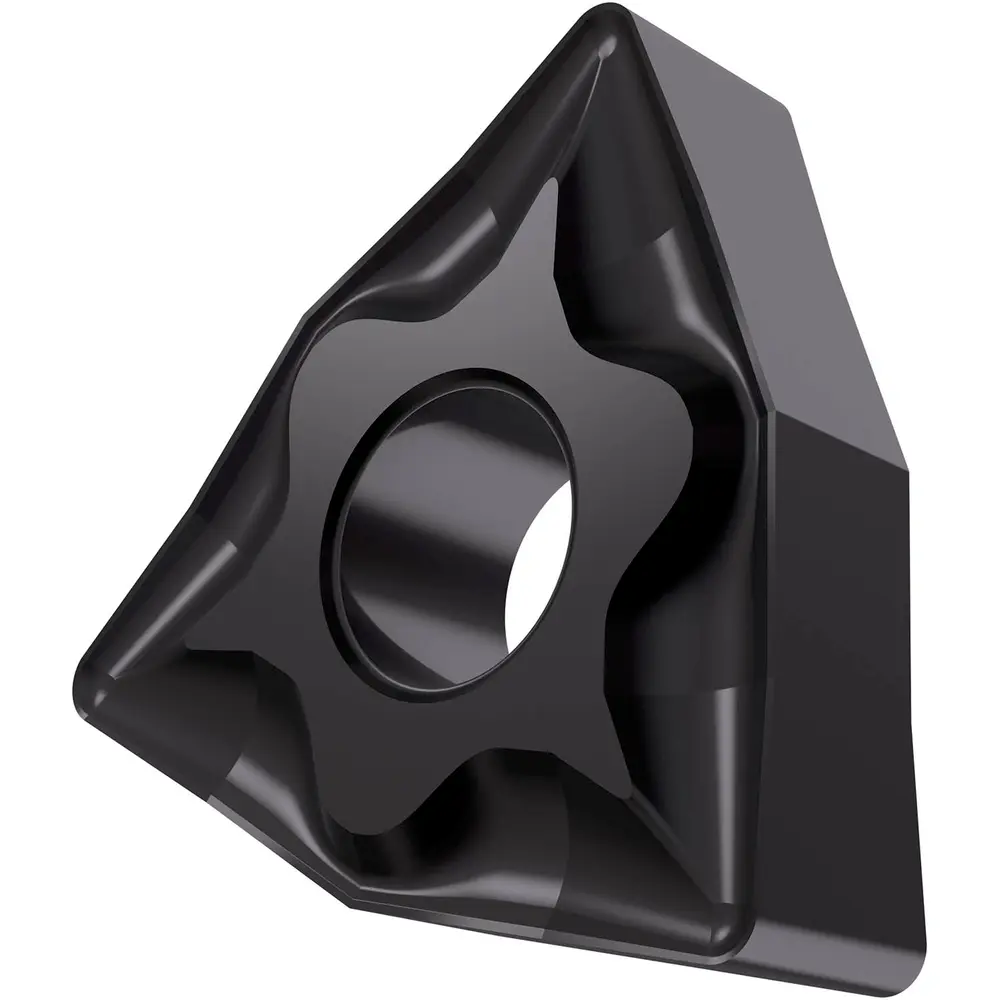 Двусторонняя негативная токарная пластина, 80° тригон с диаметром вписанной окружности 9,525 мм, толщина 4,76 мм, радиус вершины 0,8 мм, точность индексации в соответствии с классом допуска ISO-M, стружколом NF со скругленными режущими кромками, из сплава T6310, сверхмелкозернистый карбид WC-Co с покрытием PVD в диапазонах ISO P01 -P15 и M01 -M15, для чистовой и средней обработки сталей и нержавеющих сталей.