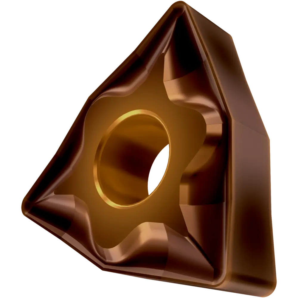 Двусторонняя негативная токарная пластина, 80° тригон с диаметром вписанной окружности 9,525 мм, толщина 4,76 мм, радиус вершины 0,8 мм, точность индексации в соответствии с классом допуска ISO-M, стружколом NF со скругленными режущими кромками, из сплава T8430, мелкозернистый карбид WC-Co с покрытием PVD в диапазонах ISO P20 -P40 и M20 -M35, для чистовой и средней обработки сталей и нержавеющих сталей.