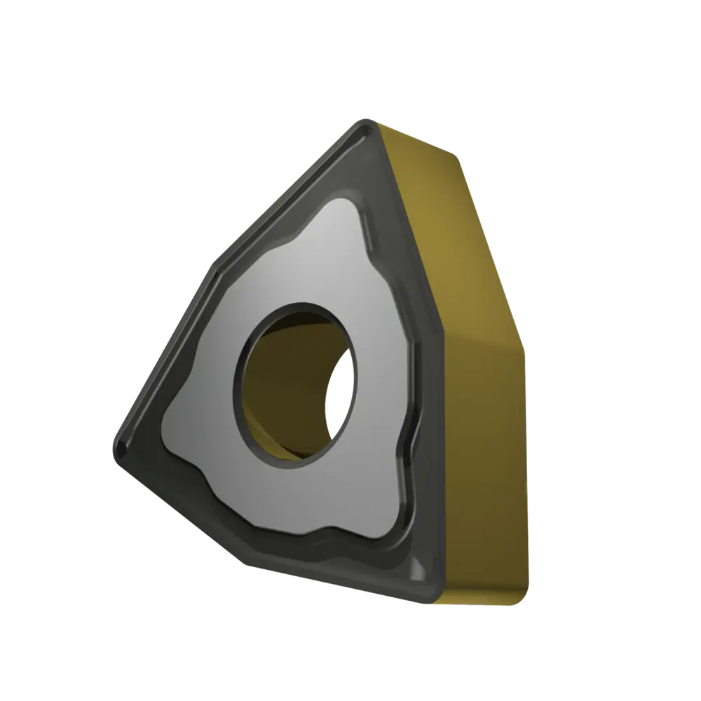 Двусторонняя негативная токарная пластина, 80° тригон с диаметром вписанной окружности 12,7 мм, толщина 4,76 мм, радиус вершины 0,8 мм, точность индексации в соответствии с классом допуска ISO-M, стружколом NM со скругленными режущими кромками, из сплава T9415, функционально-градуированного твердого сплава WC-Co с покрытием MT-CVD в диапазоне ISO P05 -P30, для чистовой и тяжелой обработки сталей.