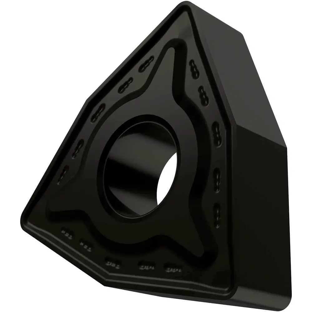 Двусторонняя негативная токарная пластина, 80° тригон с диаметром вписанной окружности 12,7 мм, толщина 4,76 мм, радиус вершины 0,8 мм, точность индексации в соответствии с классом допуска ISO-M, стружколом RM со скругленными режущими кромками, из сплава T7325, функционально-градуированного твердого сплава WC-Co с покрытием MT-CVD в диапазоне ISO M10 - M25, для средней и тяжелой обработки нержавеющих сталей