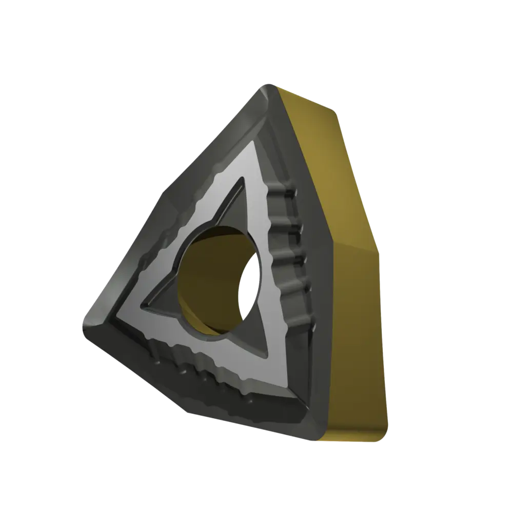Двусторонняя негативная токарная пластина, 80° тригон с диаметром вписанной окружности 12,7 мм, толщина 4,76 мм, радиус вершины 0,8 мм, точность индексации в соответствии с классом допуска ISO M, стружколом SF со скругленными режущими кромками, из сплава T9415, функционально-градуированного твердого сплава WC-Co с покрытием MT-CVD в диапазоне ISO P05 -P30, для чистовой и получистовой обработки сталей.
