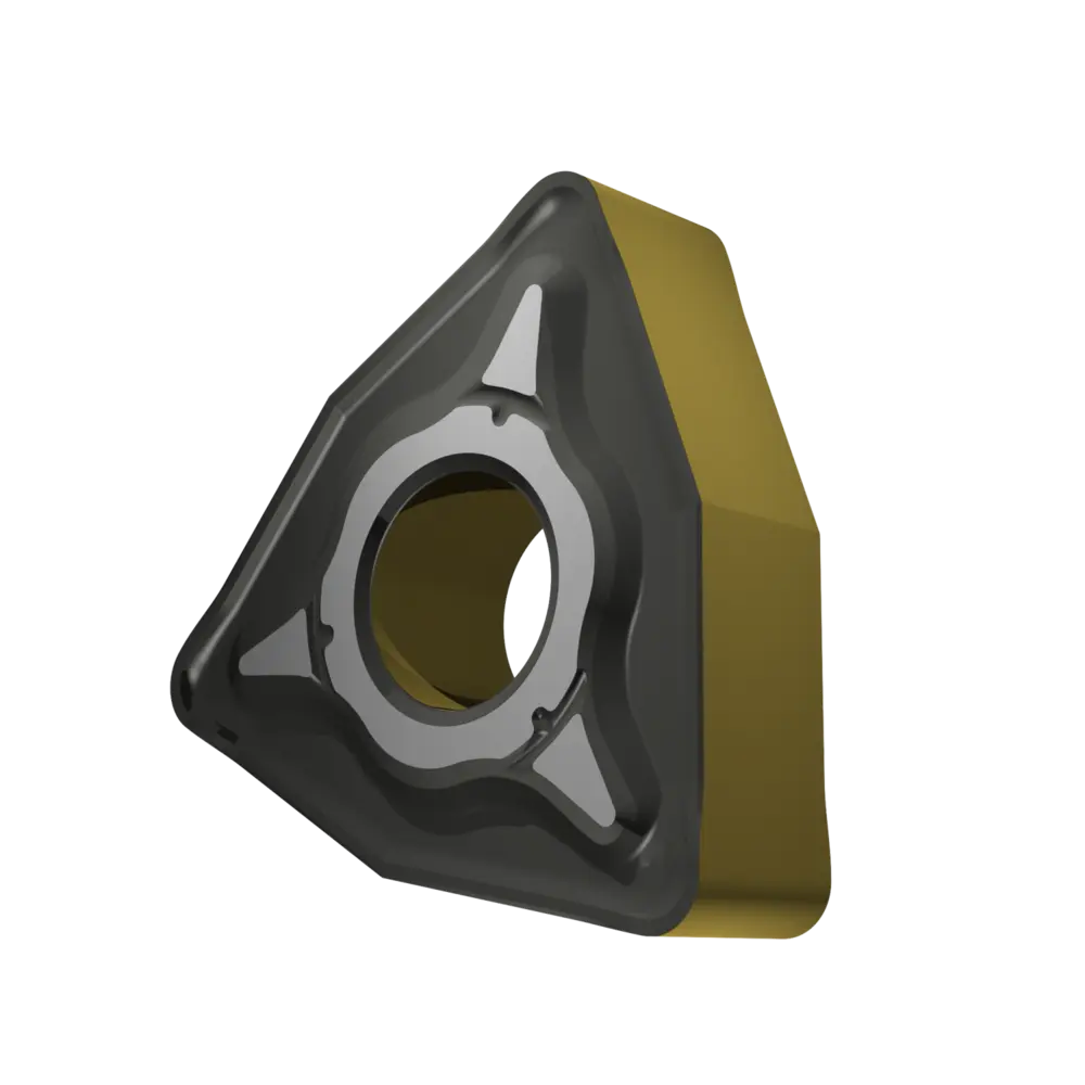 Двусторонняя негативная токарная пластина, 80° тригон с диаметром вписанной окружности 12,7 мм, толщиной 4,76 мм, радиусом при вершине 1,2 мм и точностью индексации в соответствии с классом допуска ISO-M, стружколом NRM, из сплава T9415, функционально-градуированного твердого сплава WC-Co с покрытием MT-CVD в диапазоне ISO P05 -P30, для средней и тяжелой обработки сталей.