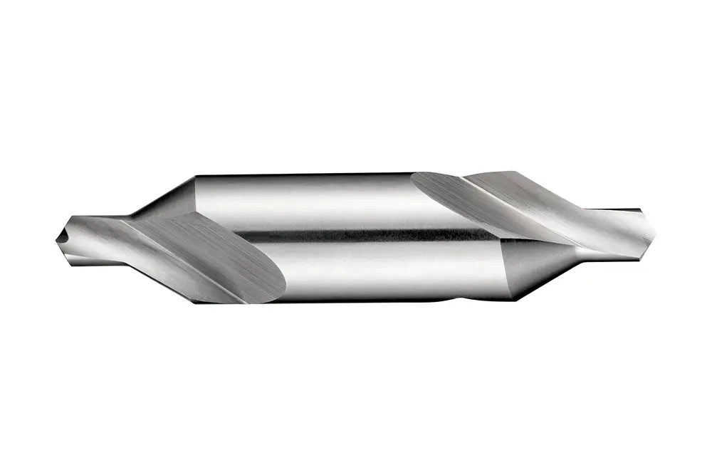 Центровочное сверло (комбинированное сверло и зенковка) с прямым коническим сечением 60°, двусторонним цилиндрическим корпусом, размером BS3, диаметром сверла 3/32 дюйма, диаметром корпуса 1/4 дюйма и общей длиной 2 дюйма в соответствии со стандартом BS 328 для выполнения центровых отверстий формы A, из быстрорежущей стали с блестящей отделкой для обработки на станке, обычной углеродистой и легированной стали, а также серого чугуна.